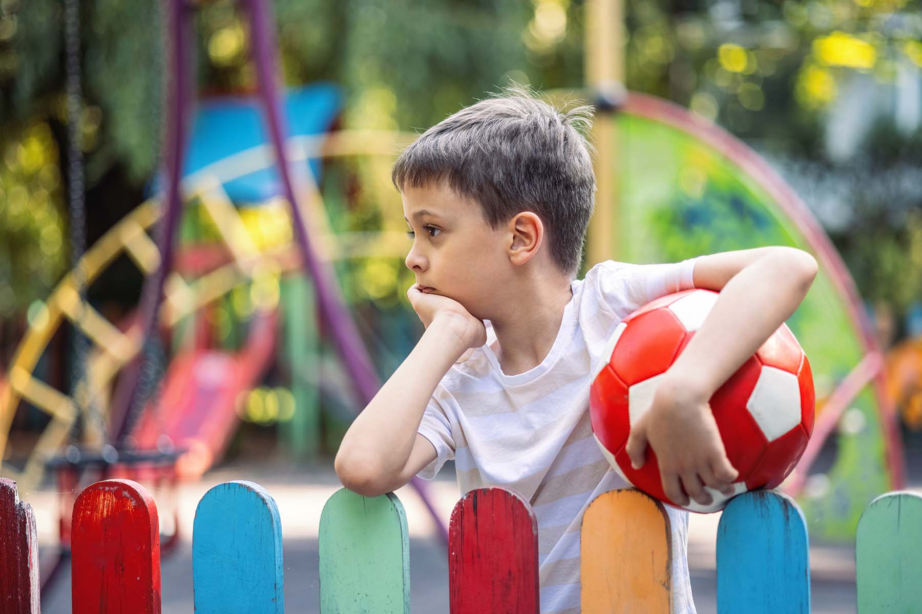 Boy holding ball and feeling lonely
